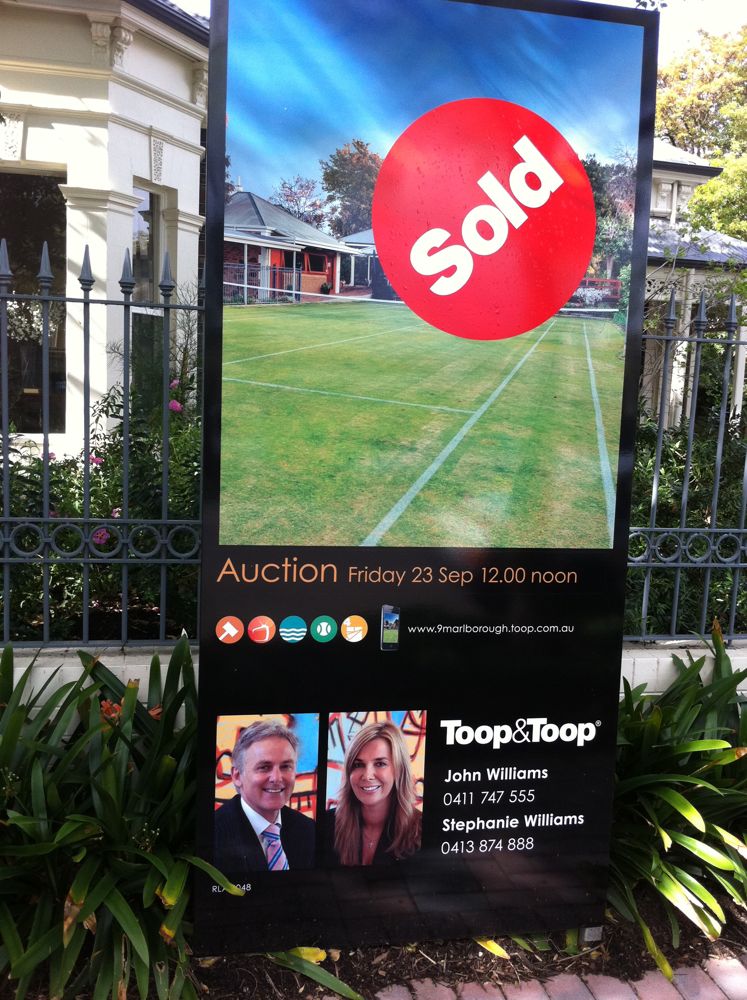 Another great sign from Toop, which shows off the tennis court out the back, and again features the property's individual website address.