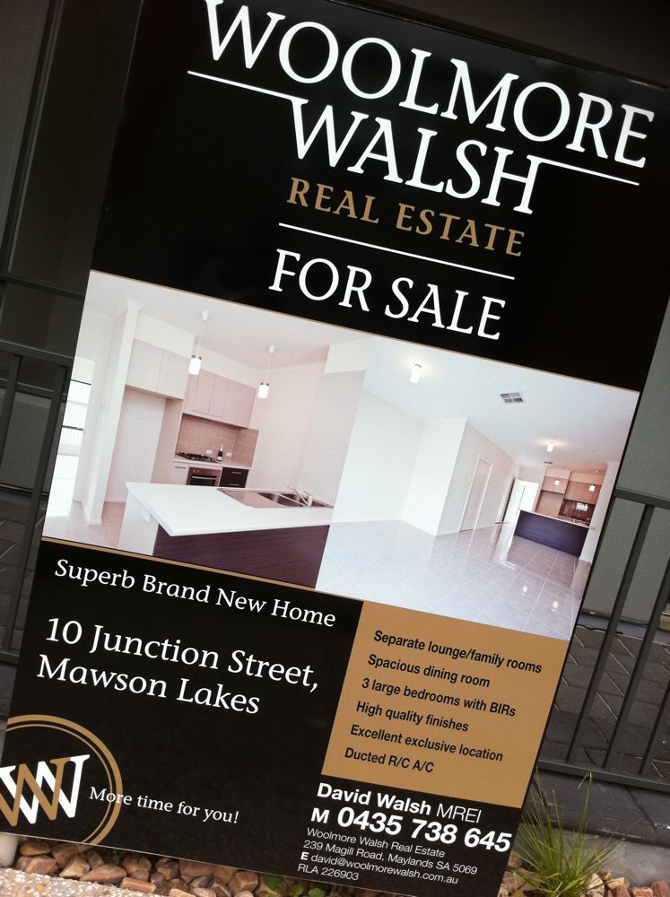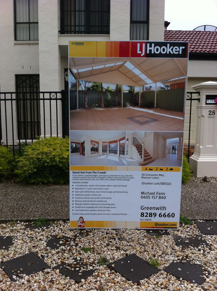 This sign in Mawson Lakes from Woolmore Walsh looks pretty classy, and features two nice interior shots. Maybe a bit much space wasted by the company branding that could be used for bigger photos, but I think it still does the job well.